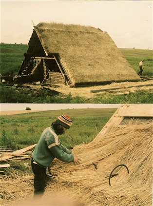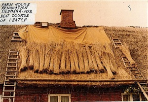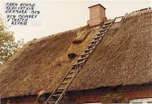 New chimney and thatch repair on a farmhouse from the late 1800’s in Denmark -1978