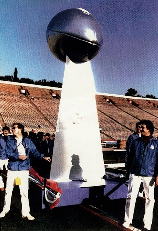 Here, Scott Peterson and myself (on the right) are laughing as we wait to roll out another trophy replica, “the Vince Lombardi Trophy”, for Superbowl XIX at Stanford Stadium, Palo Alto,CA.