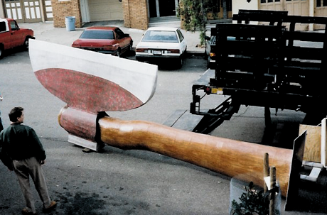 Olmstead Productions asked me to design and build this 20’ tall representation of “The Axe” trophy for the 100th playing of “The Big Game” football rivalry between the University of California at Berkeley and Stanford University. This symbol of the trophy was rolled out to mid field during the presentation ceremonies. Here it is being loaded on the truck outside my shop.