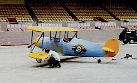 Another New Year (1990), another auditorium (The Cow Palace), I designed and built this biplane which was flown across the auditorium to the stage on a cable with the propeller turning and the drummer from Lynard Skynard (I believe it was Artimus Pyle) in the cockpit.