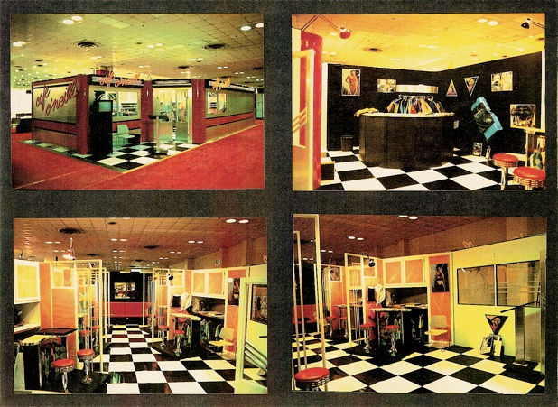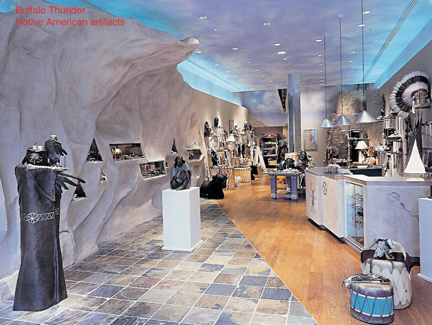 Challenge: Create unique stucco representation of canyon walls with built in display cases, sky painted ceiling, custom display/register counter, arrow shaped cast bronze shelf supports, bronze tomahawk door handles, and custom bronze war shield exterior sign