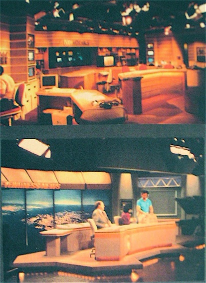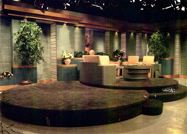 Challenge: Design structure and mechanics for background wall and circular interview set with attached motorized “satellite” stage for entertainment talent. “Satellite” stage rotated forward into camera field fully loaded with talent and gear.