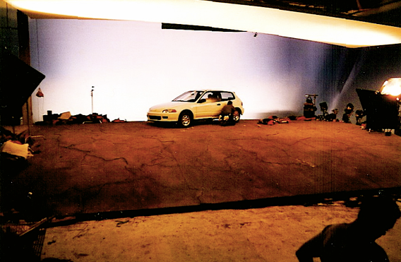 Challenge: Create staging to resemble surface of barren earth, support automobile, and allow puppeteers to insert plant “puppets” that look like fully vegetated surface. “Puppets” were withdrawn from under staging and film was reversed so it looked like plants grew up around the car as though the car was the instigator of life and evolution