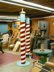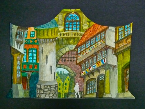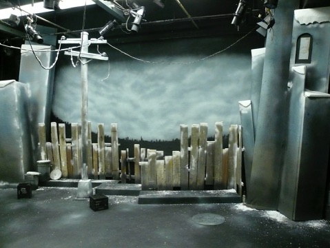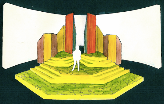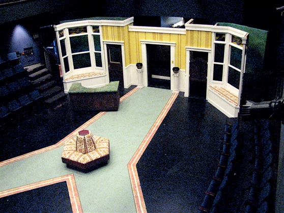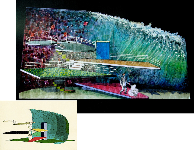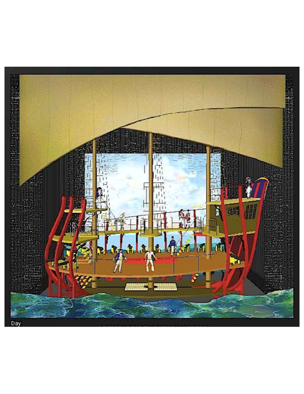 From the elevated Captains bridge SR through the several deck levels to the red gangplank DSC, the curved backdrop, which transitions from the rusty plate steel hull SR to the huge translucent wave SL threatens to envelop the Achille Lauro and its passengers.